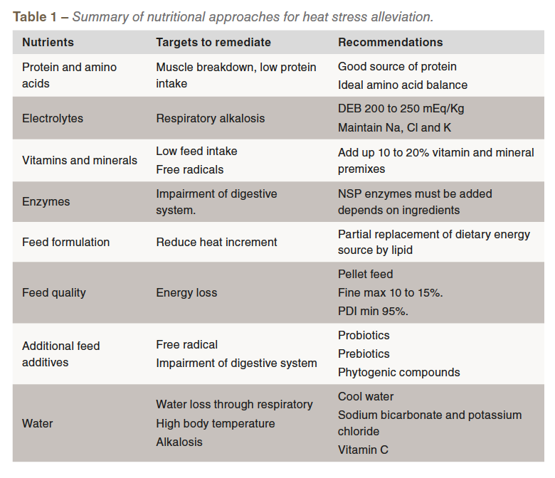 Heat stress occurs when the ambient temperature is higher than the thermo-neutral zone. Heat stress can be classified into 2 main types based on the duration of exposure: short term (acute, less than 1 week) or long term (chronic, greater than 1 week). Heat stress can impact bird physiology and growth performance leading to welfare concerns and economic losses in broiler production. Any signs of heat stress should be addressed immediately. This article aims to explain nutritional strategies to help alleviate heat stress.
