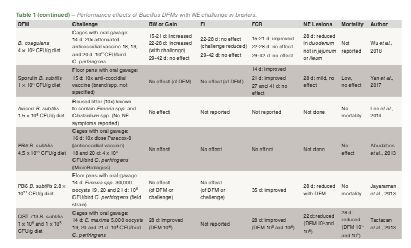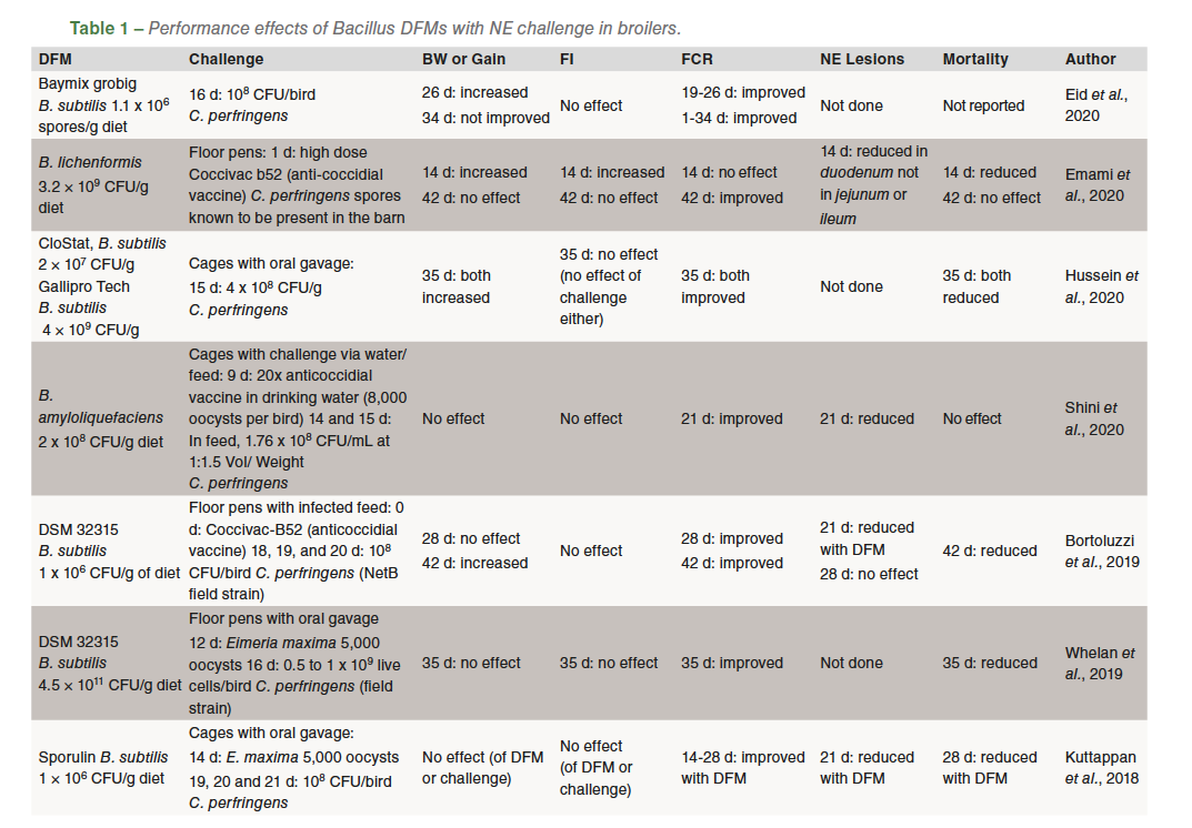 Bacillus DFM supplementation improves feed conversion ratio in most research trials with NE challenge (Table 1). Nine trials reported an improvement while in three other studies, there was no effect or improvement was age dependent. In trials without an NE challenge, approximately half the studies demonstrated no effectand the other half an improvement of DFM on feed conversion ratio.
