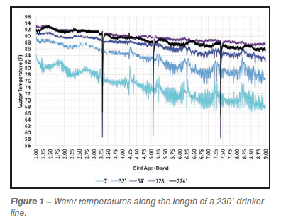 Figure 1 illustrates water temperatures along the length of a 230′ drinker line during the first week of a wintertime flock in a 40′ X 500′ broiler house. The temperature of the water entering the house’s control room from the ground was approximately 55° F. During the 30′ trip from control room to the first nipple on the drinker line, the water warmed from 55° F to between 70° F and 80° F, depending on house air temperature at the time. By the time the water reached the nipples 64′ from the beginning of the drinker line, it had warmed to essentially air temperature. Previously conducted farm studies in which the incoming water temperate was in the high forties or low sixties documented a similar trend.