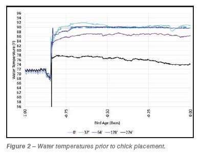 Figure 2 illustrates the water temperatures beginning the day before the chicks were placed. House air and drinker line water temperatures were approximately 70° F, 36 hours prior to chick placement. Twenty-four hours prior to chick placement (Day-0.8) house air temperature was increased to 90° F and drinker line water temperatures followed, increasing to between 85° F and 90° F, with a notable exception of those near the end of the drinker line, where they only increased to approximately 75° F. The lower water temperatures recorded near the end of the drinker line were due to the fact that the air temperature near the end of the drinker line was only in the mid-seventies as a result of loose-fitting tunnel fan shutters. When the house’s circulation fans were turned on (Day 0.3) and the air near the tunnel fans warmed to near 90° F, the drinker line water temperatures increased similarly (Figure 3).