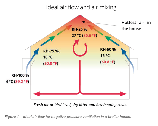 The incoming cold air must be conditioned correctly by easily attaching to the ceiling, moving towards the peak of the house where it is heated, expand and its relative humidity reduced. The air jet must then start detaching from the ceiling near the centre of the house generating a return movement at floor level in the opposite direction. This return movement towards the side walls will ensure distribution of the warmer dry air thus bringing fresh air to the birds while also removing moisture and waste gases from the litter, the birds, and the heating system (Figure 1).