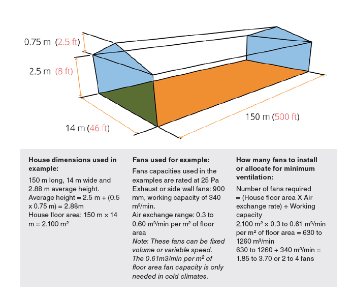The timer fan capacity should be a minimum of 0.3 m3/min per m² (1.0 cfm per ft²) in hot climates where outside temperatures rarely drop below 20 to 25 ⁰C (68 to 77 ⁰F). In cold climates a timer fan capacity of 0.61 to 0.77 m3/min per m2 (2 to 2.5 cfm/ft2) of floor area, will be needed. The challenge will always be matching the requirement with fans available in the market. Do not use large tunnel fans for the minimum ventilation system, smaller capacity fans will always afford more stable environmental control and flexibility.