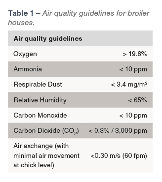 Minimum ventilation is the minimum amount of ventilation (air exchange) required to maintain the full genetic potential of the birds by ensuring an adequate supply of oxygen while removing moisture, waste products, and combustion from the environment. Table 1 is a reference guide for air quality standards that must be maintained by the minimum ventilation system.