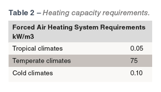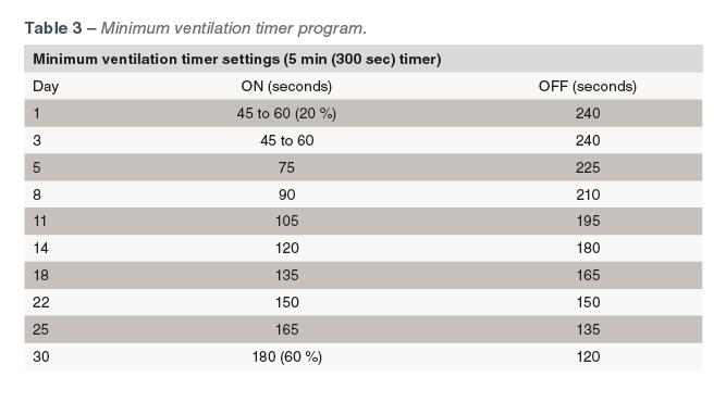 The system uses fans on a cycle timer and is independent of temperature control. Poultry houses need sufficient heating capacity (Table 2) to maintain house set-points on the cold days, while still allowing sufficient minimum ventilation, since the minimum ventilation system is the primary source of heat loss from the house. The minimum air exchange is linked to the amount of moisture added to the house by the birds, the drinking system, heating system and ventilation system. Under most conditions, maintaining good moisture control should supply adequate air quality for the birds and ensure carbon dioxide levels remain below 3000 ppm.