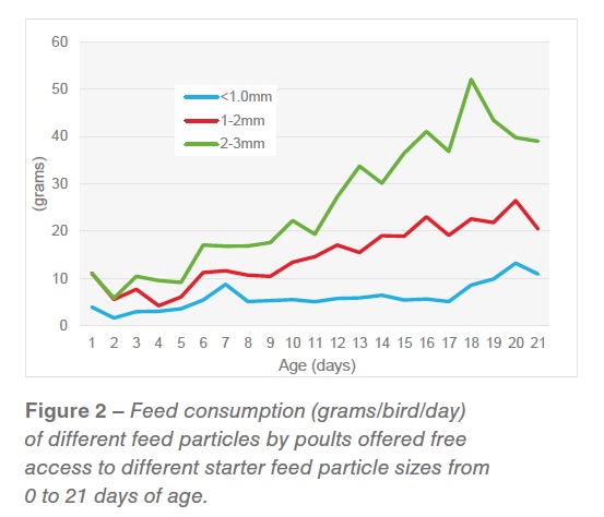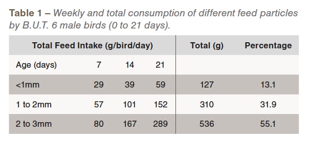 The first evaluation assessed the impact of crumb particle size on feed intake in turkey poults from 0 to 3 weeks of age. A standard crumbled starter diet was sieved into three different particle sizes; small (<1mm), medium (1 to 2mm) and large (>3mm) and provided free choice to male B.U.T. 6 poults. Feed consumption of each feed particle size was measured daily during the entire period of the trial. The feed consumption data (see Figure 2) shows poults have a clear preference for medium and larger particle sizes with much lower preference for smaller particles (<1mm). This trend was quite consistent through the entire period from 0 to 21 days of age. The proportion of each particle size consumed was measured for each period and total consumption assessed over the entire period (see Table 1). The study did not include assessment of feed particles larger than 3mm, however the overall trend shows poults have a consistent preference for larger particle sizes with much lower preference for smaller particles. This trend was quite consistent through the entire period with a tendency towards preference for larger particles with increasing age.