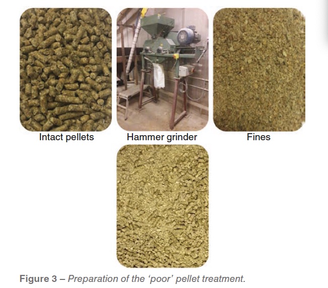 B.U.T. 6 males ‘good’ and ‘poor’ quality crumbs and pellets from 0 to 20 weeks. Diets were prepared according to the ATL recommended nutrient specifications and feeding programme. The starter diet was provided as a sieved crumb for the ‘good’ feed physical quality control and an unsieved crumb for the ‘poor’ feed physical treatment. The ‘poor’ pellet quality treatment was prepared by hammer grinding pellets to a fine consistency (fines) and then blended with intact pellets to result in a 50:50 mix of pellets and fines (see Figure 3).