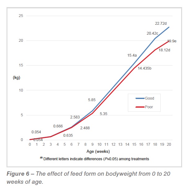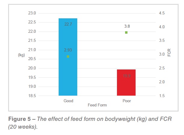The mix of fines and pellets resulted in a feed physical quality similar to poor feed physical quality which can sometimes be seen in the field (see Figure 4). The results showed there was a significant depression in bodyweights to 20 weeks of age; the poor treatment resulted in a 12.3% reduction in bodyweight loss relative to the control. FCR deteriorated by 36% in the poor treatment relative to the control at 20 weeks of age (see Figure 5).