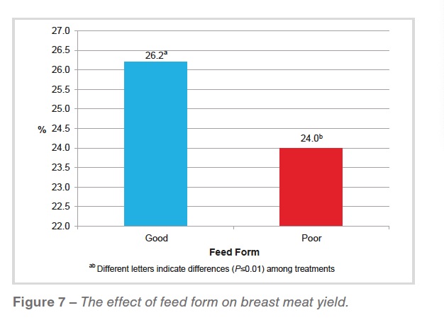 The negative effect of poor feed form on bodyweight was evident through the lifetime of the birds. This effect was detected as early as 3 weeks of age and continued, with increasing effect, to the end of the trial period (see Figure 6). Breast meat yield was assessed at 20 weeks of age, the poor treatment reduced breast meat yield by 8.4% (see Figure 7). This effect on breast meat yield is most likely related to the effect of feed form on physiological development to this age i.e. the birds fed the poor feed form were physiologically less developed at 20 weeks of age compared to the birds fed the control, hence breast meat was not as well developed. The effect of feed form on performance was much greater than previously observed; in particular the magnitude of effect on FCR was unexpected. The data suggests that those birds fed the poor feed form ate significantly more feed than birds fed the control diet but did not convert this feed to liveweight. Feed wastage is often evident when birds are fed poor quality pellets. While feed wastage was evident in some pens, this was superficial and not enough to account for the degree of difference in FCR. Another possible explanation for the degree of effect on FCR may be related to the preparation of the ‘poor’ feed treatment. The degree of fine material within the poor feed treatment was very significant and also the extent of pulverisation during the feed grinding process may have resulted in a more extreme ‘poor’ feed form than assessed in some other trials which compared pellets to mash diets. Nonetheless, the poor treatment was representative of poor feed form in the field and the results reinforce the importance of ensuring feed physical quality is optimal and is adequately assessed within the organisation.
