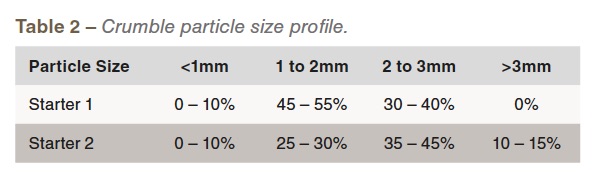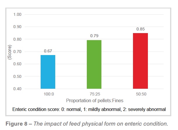 Further evaluations assessed the impact of feed form on enteric condition; birds fed poor feed physical quality from day old to 12 weeks of age had poorer enteric condition (see Figure 8) and also experienced increased incidence of gut leakage relative to those fed good quality crumbs and intact pellets. This effect was also detected in much older birds; 18-week-old birds fed with a poor feed physical quality feed for a shorter period of time (one and a half weeks) also had poorer enteric condition relative to those fed intact pellets. These results demonstrate the impact of feed physical quality is relevant at an enteric level and not just from a farm or processing point of view. Assessment of feed physical quality is usually measured by a sieving assessment of crumbs and a pellet durability index (PDI). The target particle size profile for starter diets in a crumb form are as follows in Table 2. Pelleted products must contain a minimised quantity of fines particles (<1mm), aiming for less than 10% fines (farm sample assessment) with the remainder as intact pellets.