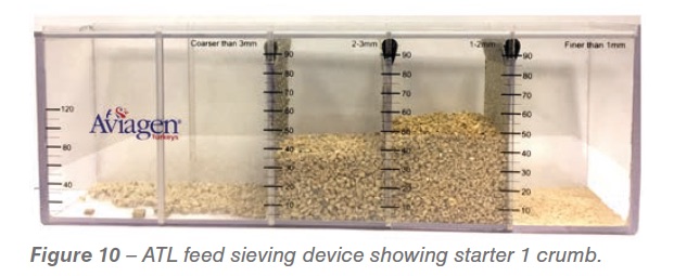 These assessments involve placing a sample of feed through an aggressive process which is aimed at replicating the physical insults to the pellet in the field. This assessment allows the mill to know whether manufactured feeds meet physical quality standards. Assessment of feed physical quality should not just be conducted at the mill, farm assessments give a good indication as to what is provided to the bird especially if the sample is taken directly from the feed pan. This can be conducted via the use of a hand sieving device (see Figure ten); the procedure is straightforward and practical for most farms to conduct. For more information on the use of the hand sieve, please contact turkeysltd@aviagen.com.