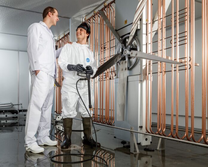 After this, all surfaces are ready for a thorough rinse with pressure water. Start with the surfaces that are highest up – e.g. ceilings in setters and hatchers – and work down.
