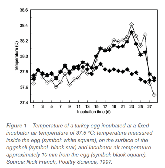 The internal egg temperature is of paramount importance… But how to monitor this parameter? An important finding illustrated by the graph is that the eggshell temperature closely follows the internal temperature. Hence, the eggshell temperature is routinely used in commercial incubation to pragmatically estimate the internal temperature. For both turkey and broiler eggs, the consensus is that the optimum eggshell temperature during incubation is around 37.8 °C (100 °F). When the eggshell temperature deviates from the optimum, incubation performance is at risk.