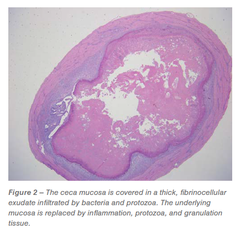 Ceca: Approximately 60% to 95% of the mucosa was replaced by predominately granulomatous inflammation and granulation tissue infiltrated by pleomorphic bacteria and Histomonas trophozoites (Figures 2 and 3). The luminal surface was covered in a fibrinocellular exudate infiltrated by protozoa and bacteria. The underlying submucosa was effaced by histiocytic to pyogranulomatous inflammation and granulation tissue that is infiltrated by trophozoites (Figures 2 and 3).