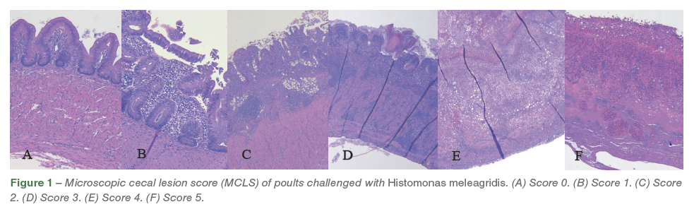 A veterinary anatomic pathologist was blinded for this study and performed all histological evaluations. On histopathological evaluation, ceca was graded from 0-5 based on microscopic cecal lesion score (MCLS) as follows. Score 0 = normal ceca (Figure 1A); Score 1 = mild to moderate erosion of mucosa, expansion of lamina propria with histiocytes, few trophozoites, with intact mucosa and submucosa (Figure 1B); Score 2 = moderate to abundant expansion of lamina propria with moderate to abundant histiocytes, trophozoites, mucosa and submucosa are moderately infiltrated, mucosa is significantly ulcerated with intact tunica muscularis (Figure 1C); Score 3 = lamina propria and mucosa is extensively effaced by histiocytes and trophozoites, submucosa is moderately infiltrated and effaced by inflammation and organisms, tunica muscularis is infiltrated by inflammation/ protozoa but architecture can be clearly discerned (Figure 1D); Score 4 = lamina propria, mucosa, submucosa is severely to completely effaced by histiocytes and trophozoites, tunica muscularis is severely infiltrated by inflammation/protozoa with extensive loss of muscle architecture (Figure 1E); Score 5 = full transmural necrosis (Figure 1F).