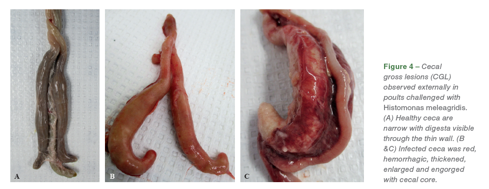 Poults were necropsied and classified as positive or negative based on gross lesions in the liver at nine days post-challenge. Histology samples were collected in 10% neutral buffered formalin. Ceca and bursa samples were collected from all 5 comingled placebo birds. Eleven cecal samples and 10 bursal samples (one sample was missed during the collection process) were collected from challenged poults.