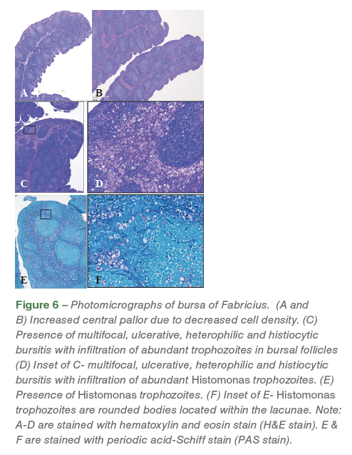 Bursal lymphoid follicles had decreased lymphoid cell density and mildly increased numbers of histiocytes (Figure 6). Bursa was graded and assessed as a percent of lymphoid follicles with increased (mild, moderate, severe) central pallor due to decreased cell density in sections containing more than 30 follicles (Figure 6. A, B). Pale eosinophilic, protozoal trophozoites with a 3-5 μm diameter clear zone surrounding the organism was noticed in the bursa of Fabricius (Figure 6. C, D, E, F).