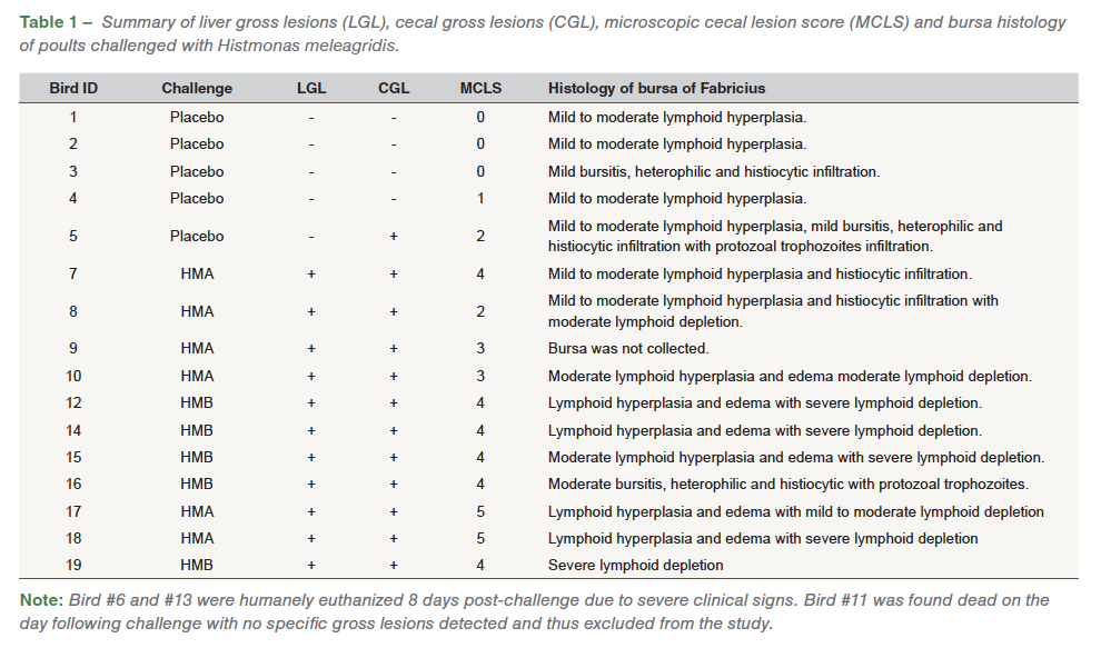 Poults (n=14) were challenged by intra-cloacal infection wild-type H. meleagridis field isolates. Placebo controls (n=5) were commingled with the challenged poults. Poults were raised in an isolator and provided ad libitum feed and water. Poults were necropsied nine days post-challenge. All challenged poults and one of the commingled placebo birds had distinctive cecal lesions. On histology, cecal lesions ranging from mild edema, histiocytic and heterophilic inflammation, to necroulcerative and fibrinonecrotizing typhlitis with Histomonas trophozoites were observed in the challenged poults. Microscopic lesions in the bursa of Fabricius of challenged poults ranged from mild to moderate lymphoid hyperplasia, bursitis, heterophilic and histiocytic infiltration accompanied by decreased lymphoid cell density and presence of Histomonas trophozoites. The severity of cecal lesions positively correlated with histologic changes in the bursa of Fabricius.