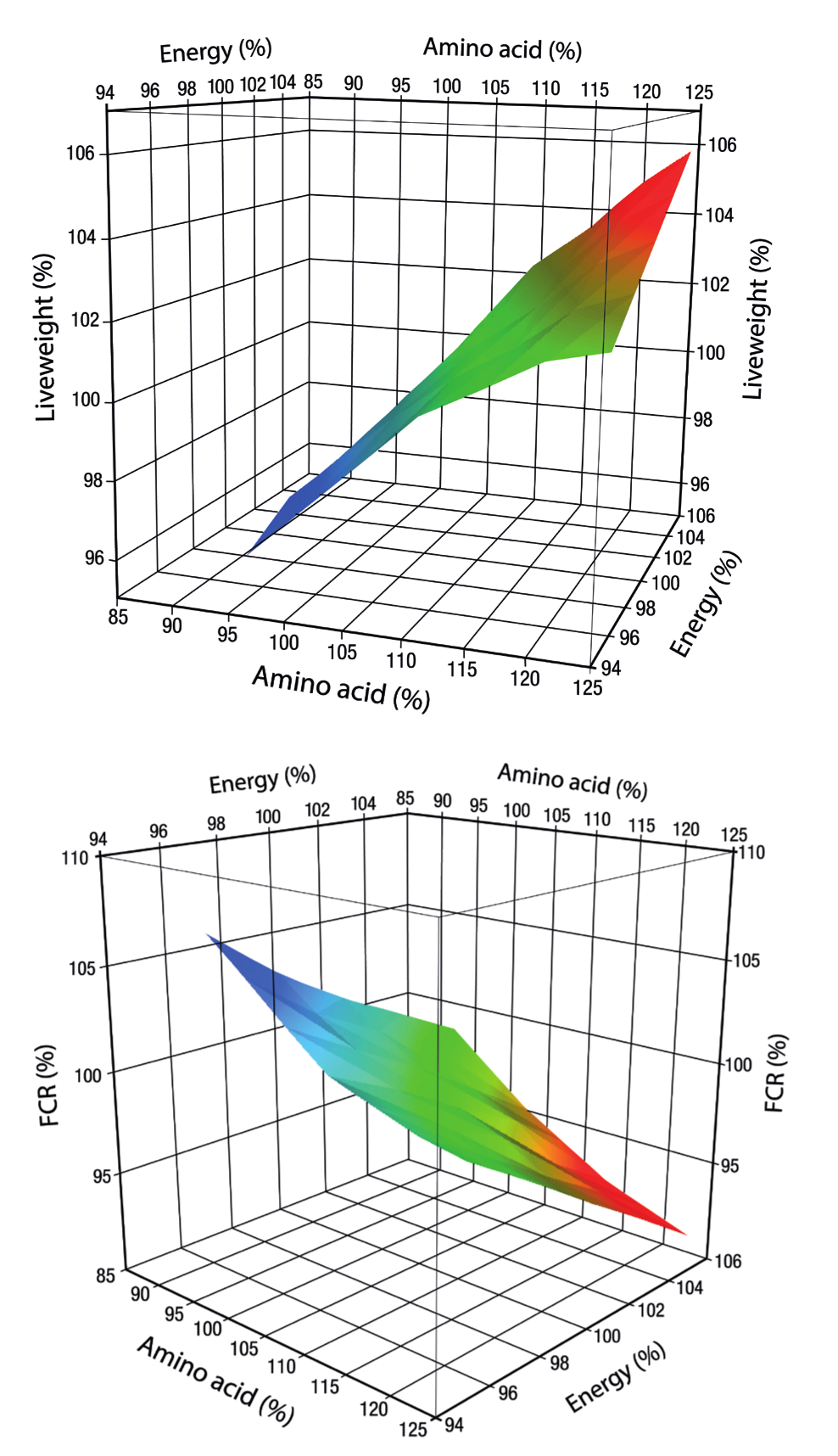 Performance data from these trials were collated to assess the response of turkeys to a range of nutrient densities. The surface plot graph (Figure 1A, 1B) shows liveweight and feed conversion ratio (FCR) responses to altering nutrient density. Both liveweight and FCR are responsive to both amino acid and energy density (expressed as percentage relative to the 100% control), the response for both traits was optimised at the highest energy and amino acid density. The surface plot graphs also shows that energy density appears to impact positively on the response to increasing amino acid concentration suggesting that diet energy density should be considered when feeding higher amino acid densities.