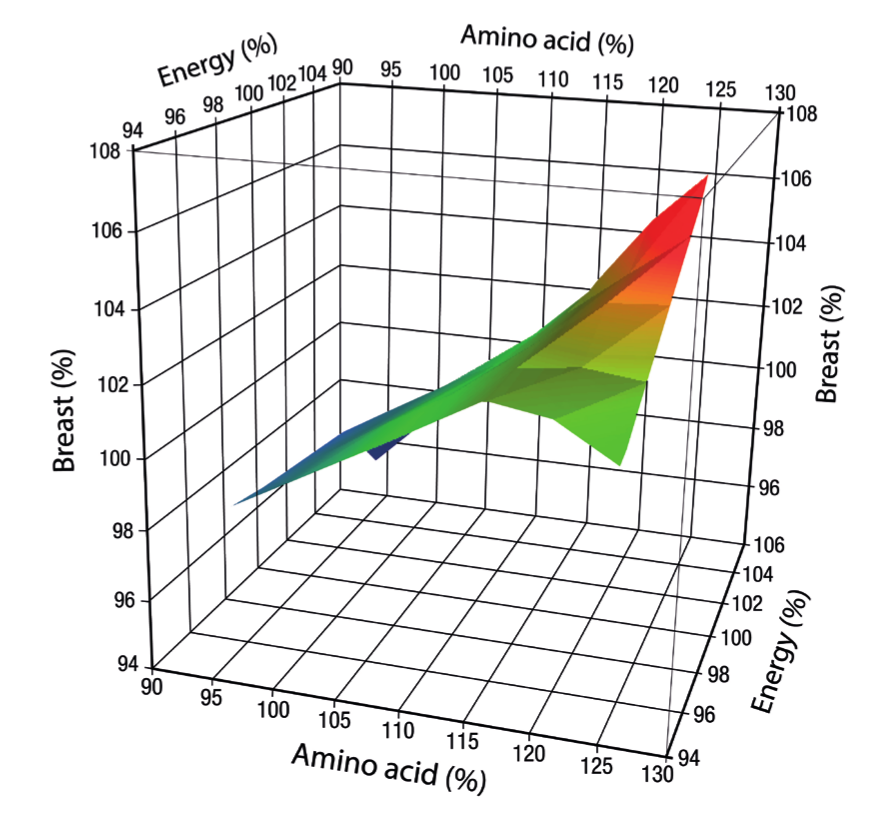 In summary, the data demonstrates the ability of the modern bird to respond to a wide range of nutrient levels. Liveweight, FCR and breast meat yield are responsive to nutrient density and show optimal responses on or above the commercial standard. Optimal economic performance is realised at different nutrient densities and are dependent on the objectives of the business, for example farm or processing margin. Feed prices have a significant impact on the optimal diet nutrient density and highlights the importance of nutritionists reviewing feeding programmes especially during periods of volatile raw material prices.
