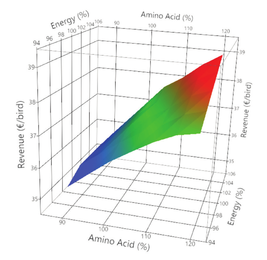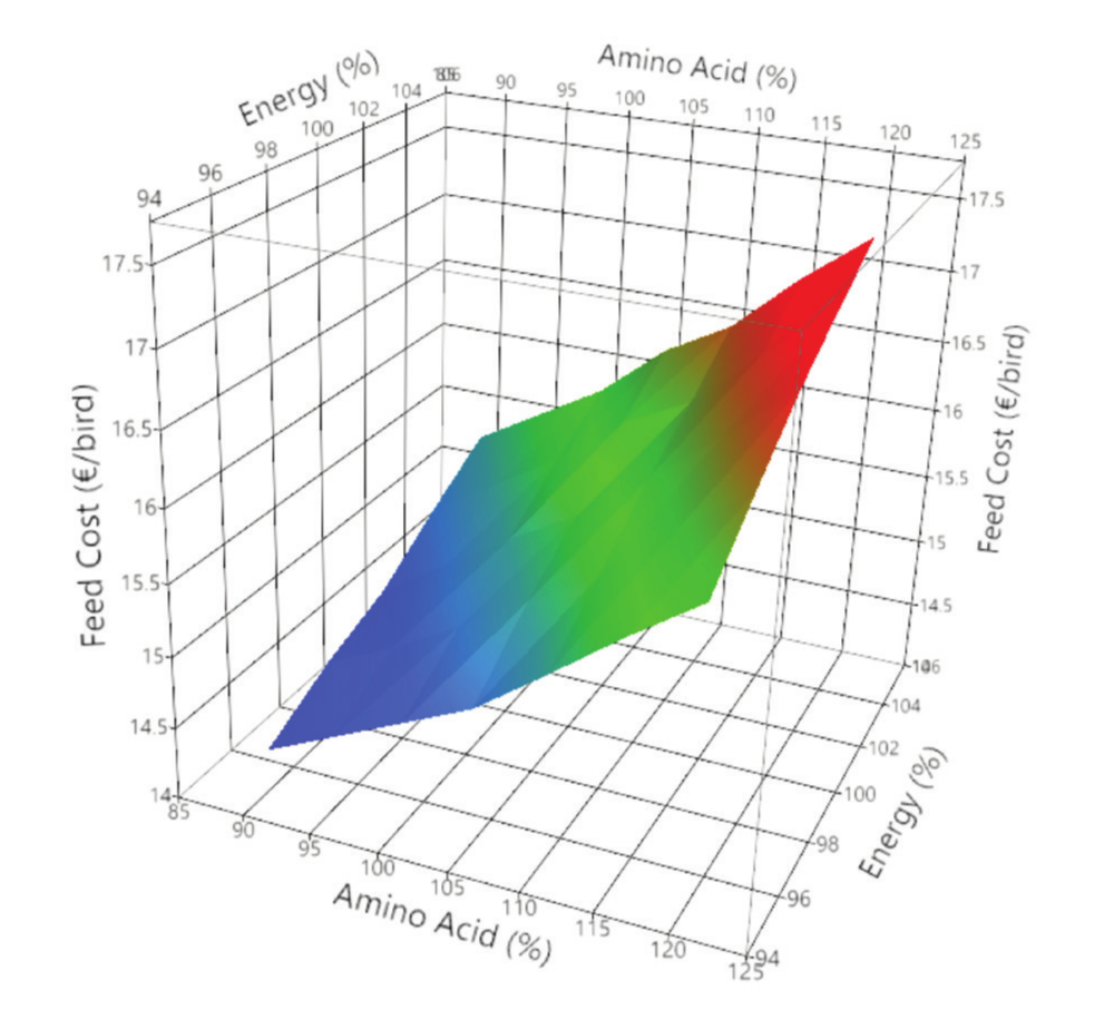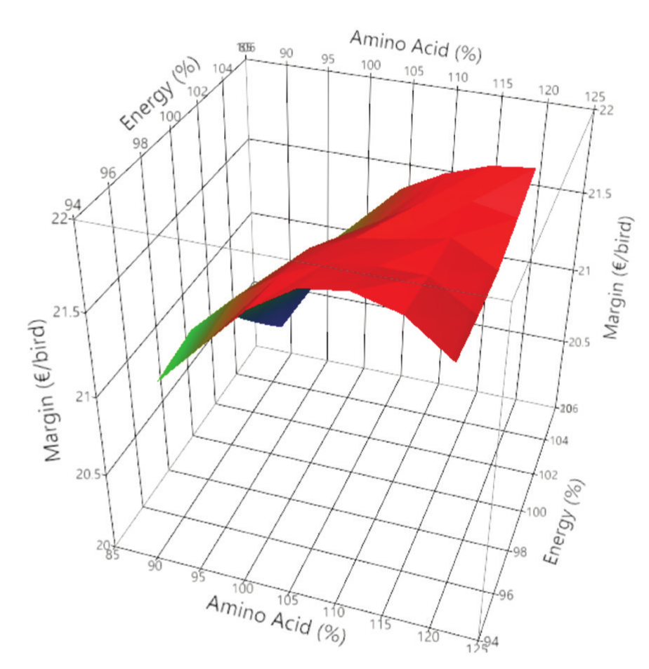 Based on existing raw material costs, higher margin (after feed cost) is achieved at higher amino acid density and a lower energy density than the existing standard. Optimal farm margin is achieved at an amino acid density above the standard (105% of standard) and at the lowest energy density (95% of standard). The lowest farm margin was at the highest energy (105%) and lowest amino acid concentration (90%). Higher energy densities may achieve higher biological performance however this is outweighed by an increased feed cost (€/bird) relative to lower energy density levels.