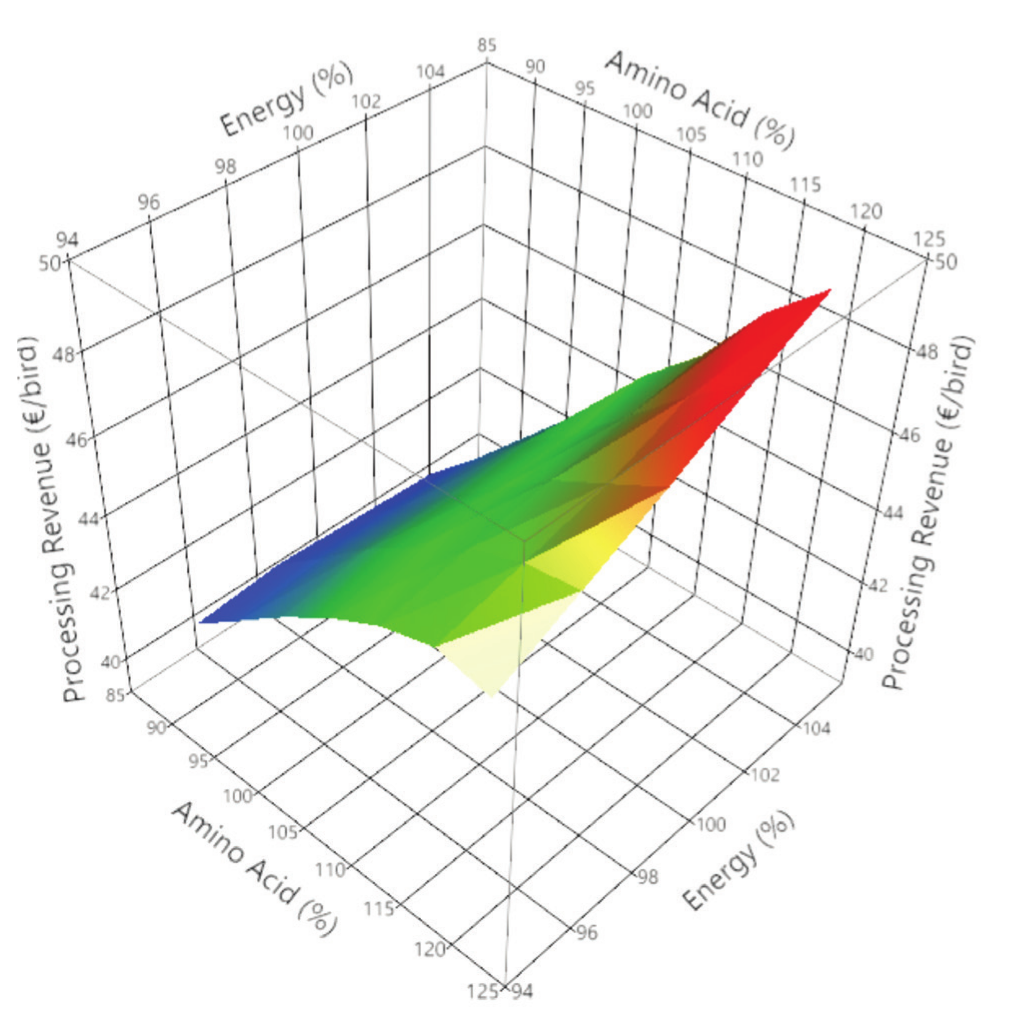 Figure 6 – Processing revenue (€/bird) at altering amino acid and energy densities (% of standard)