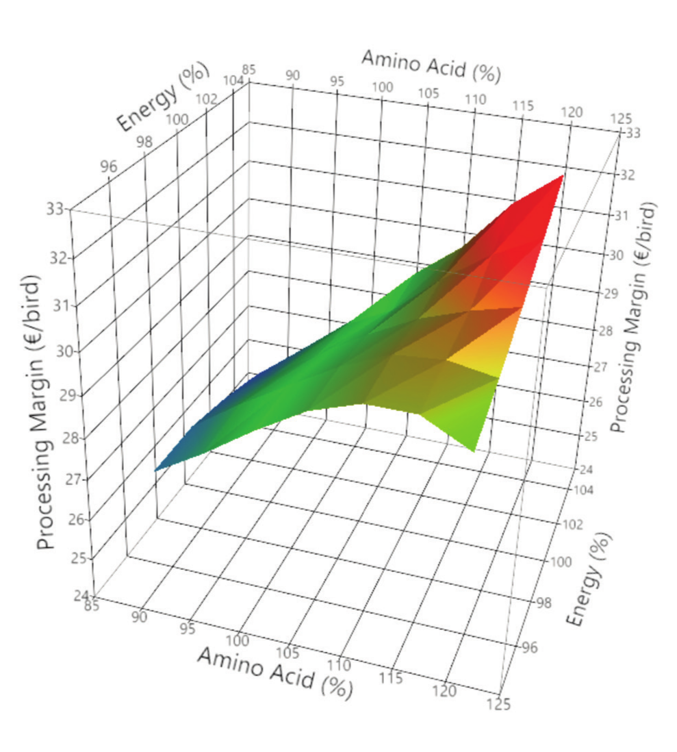 Figure 7 – Processing margin (€/bird) at altering amino acid and energy densities (% of standard)