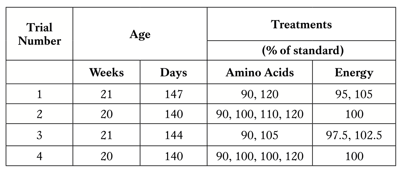 Table 1 – A summary of energy and amino acid response trials