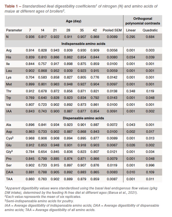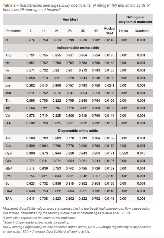 The inclusion of barley in poultry diets remains limited because of relatively low metabolisable energy, high content of fibre and high soluble and insoluble non-starch polysaccharide (NSP) contents. Because of their viscous nature, the water-soluble fractions of NSP in barley exert a negative impact on the digestion and absorption of nutrients, including amino acids. Despite the potential effects of age, only sporadic and inconsistent data exist on the age influence on AA digestibility of ingredients in broilers. Although several studies have reported the ileal digestibility of AA in a range of feed ingredients, only a few exist on the age-related standardised AA digestibility and the data are limited to two or three specific broiler ages. To the authors knowledge, no studies have investigated the standardised ileal digestibility coefficients (SIDC) of AA in maize and barley from hatching to the end of growth cycle of commercial broilers. The current study was designed to determine the SIDC AA in maize and barley at six different ages (days 7, 14, 21, 28, 35 and, 42 post-hatch) of broilers.