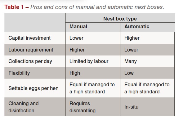 There are two nest box types, manual and automatic nests. Either system has its own benefits and can be compared in Table 1.