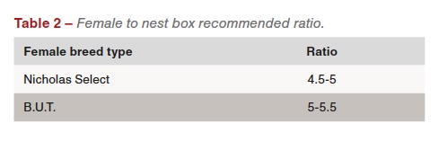 Ensure that the planned female stocking density is correct for the house area and that you have sufficient nest boxes for the females to prevent floor eggs and maximise production of good quality settable eggs. Table 2 below shows the recommended number of females per nest box for Nicholas Select females and B.U.T. Females. Insufficient next boxes can reduce settable egg numbers by increasing the number of floor eggs, the number of broody birds and reject eggs.