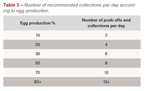 The nest-box opening and closing mechanism should be run twice per day. This practice will help familiarise the turkeys to the operation of the nest mechanism and avoid any stress associated with its activation. Automatic nest boxes should be open even at night until 20 to 30% of production is reached. Once this has been reached, nests should be opened 30 minutes after lights have come on and closed 30 minutes before lights will be switched off. The stockman should assess the level of nest box activity to determine when to push-off the females and collect the eggs. Gradually increase the number of push-offs from the nests as the egg production increases, see example in Table 3 below.