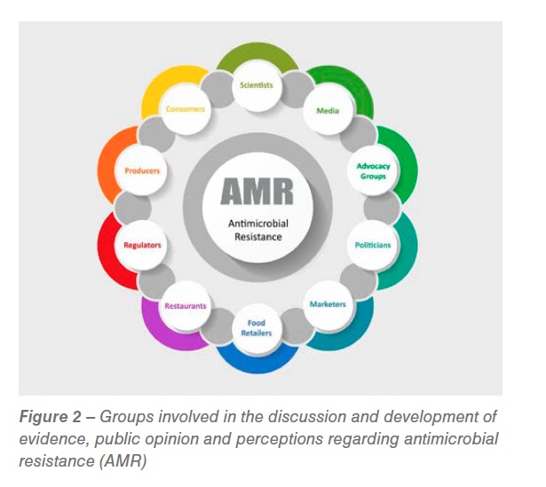 There is an increasing discussion about the potential dangers of animal food products contaminated with “superbugs” that could cause severe illnesses. Although there has been limited evidence, recent documented episodes of foodborne disease attributed to poultry products have increased unfavorable perceptions and decreased customer confidence. Consequently, all these issues have captured the attention of politicians, marketers, retailers and restaurants that are well attuned to customer demands and business opportunities. Regulatory agencies have set new restrictions and requirements, which continue to be updated and modified to ensure food safety. Figure 2 shows the main groups involved in the discussion and evolution of public opinion and perception.