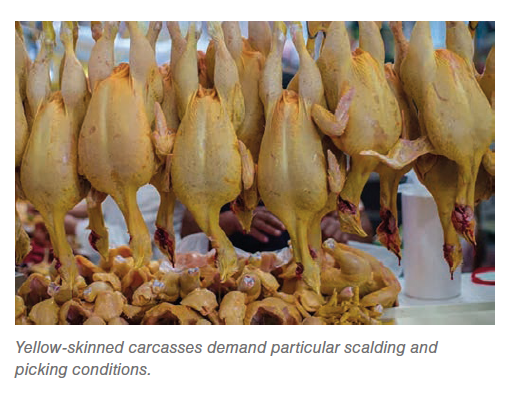 Scalding for either white- or yellow-skinned carcasses is a matter of market preference. However, it is important to be aware that yellow-skinned carcasses require longer scalding time at lower temperature, and a longer and rougher, thus riskier, picking process when compared to white-skinned carcasses.