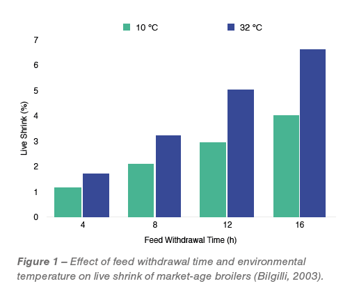 As the live weight shrink along phase two is driven by its duration and the temperature birds are exposed to from farm to plant (Figure 1), its magnitude may vary from 0.10% of the body weight per hour up to as high as 0.42%/h, or even more, according to different authors.