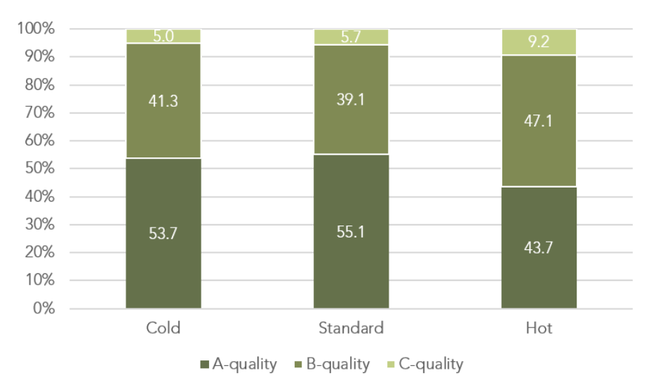 Figure 1 illustrates the average hatch percentages per trial group (Cold; Standard; Hot), but split by A-B-C chick quality categorization. These results show that relevant differences have been recorded. The mean A-quality hatch percentages are higher for the Standard group (55.1%), followed by the Cold group (53.7%). At the same time, there is a significant drop in the results for the Hot group (43.7%). Moreover, the Hot group shows a higher mean percentage of C-quality chicks (9.2%).