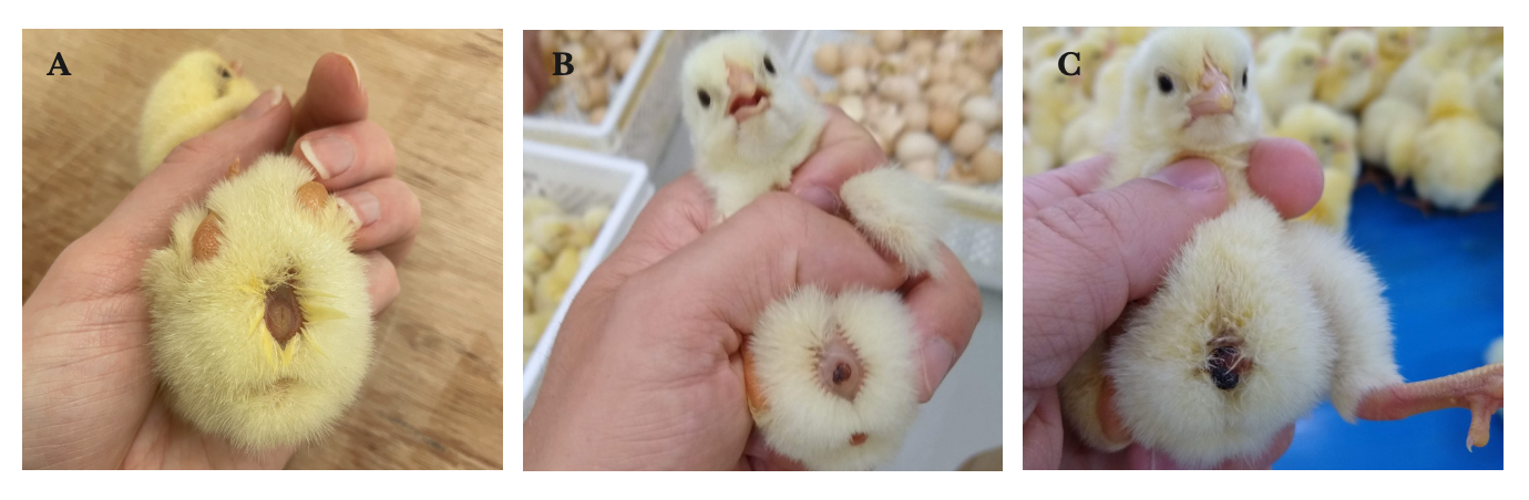 Important to note is that the A-B-C classification for navel quality used in the trial is not the same as the chick quality standards used during daily quality control in commercial hatcheries. In the trial, the navel details were individually checked and scored. The C-quality chicks from the trial would be discarded as culls during chick grading at the hatchery, whereas the B-quality chicks from the trial would be included as saleable chicks together with the A-quality chicks.